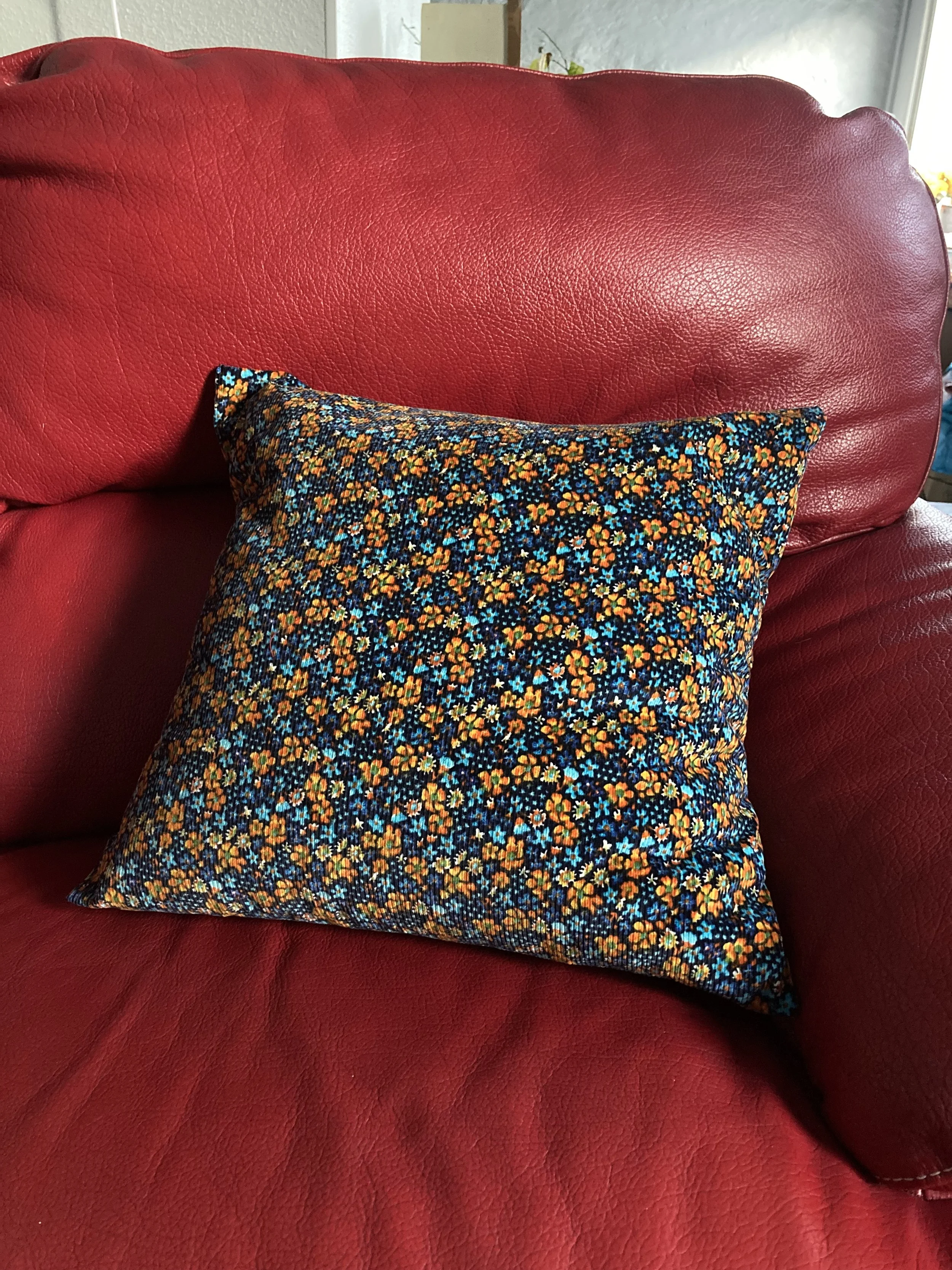 Ce coussin est cousu main en tissu de seconde main.